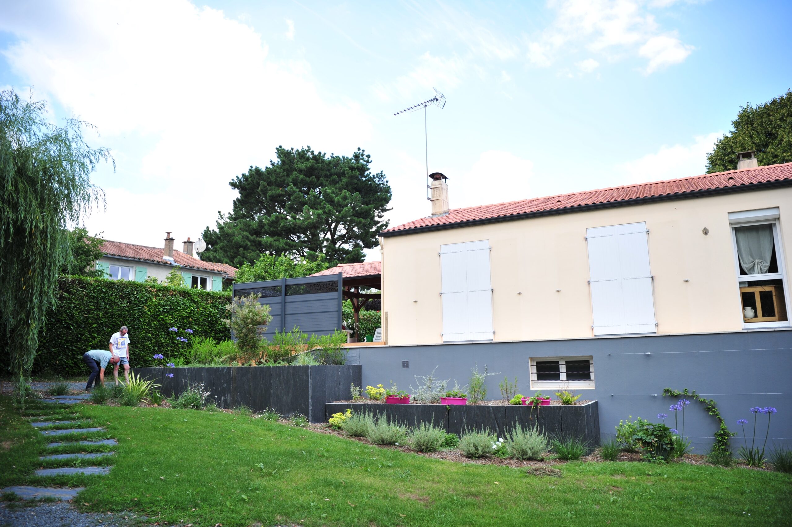 Le soubassement de la maison a été repeint dans un gris anthracite soutenu. Ce choix permet de « gommer » visuellement la hauteur du mur tout en créant un rappel chromatique parfait avec l’ardoise et les nouveaux brise-vue installés sur la terrasse.