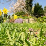 Des touches de fleurs mauves et bleues (Agapanthes, Lavandes) pour le contraste avec le vert profond du gazon.