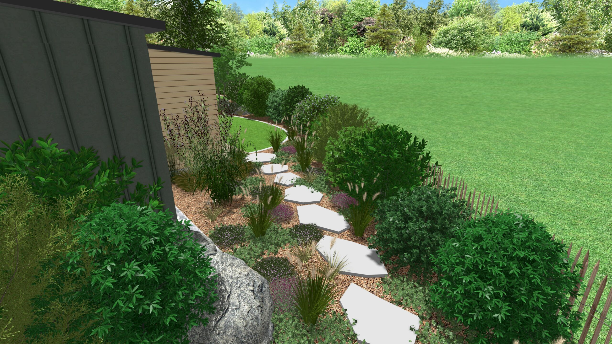 Parce qu’un beau jardin doit aussi être un jardin à vivre, nous avons veillé à intégrer harmonieusement les zones de loisirs. Le trampoline et les espaces de jeux s’insèrent naturellement entre les massifs, permettant aux enfants de profiter de l’extérieur sans dénaturer l’esthétique globale du parc.